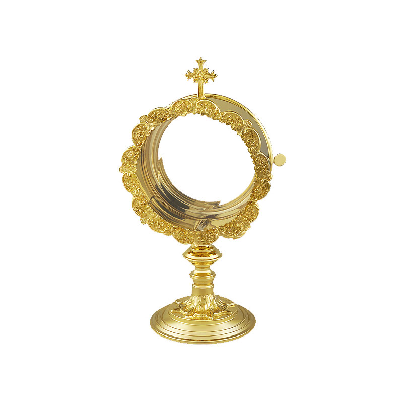 Kustodia przeszklona z ornamentem roślinnym, model KUS06, jest wykonana z mosiądzu i pokryta warstwą złota galwanicznego, zgodnie z przepisami liturgicznymi wyznaczającymi normy wykonania naczyń, w których jest przechowywany Najświętszy Sakrament.